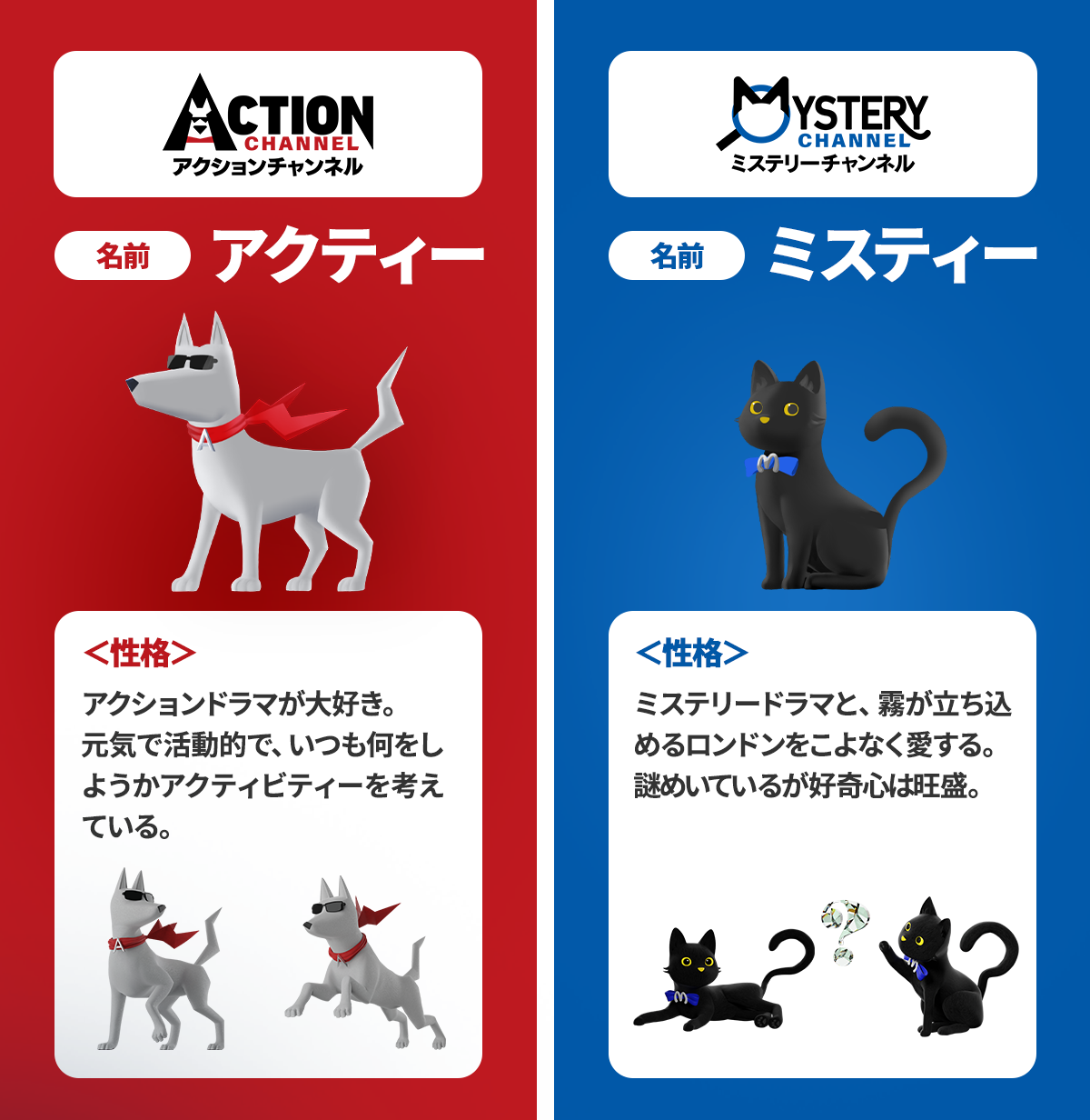 昨年10月にチャンネル名を「アクションチャンネル」「ミステリーチャンネル」にリニューアルし、よりチャンネルに親しみを持っていただきたいという思いでキャラクターを誕生させました。アクションチャンネルのキャラクター(犬)は、元気で活動的な意味を込めた「アクティー」に、ミステリーチャンネルのキャラクター(猫)は、霧が立ちこむように謎めいたイメージから「ミスティー」と命名しました。両チャンネルの“顔”として、視聴者の皆様により身近に感じていただくとともに、長く愛していただけるよう「アクティー」「ミスティー」を通じて様々な展開をしてまいります。